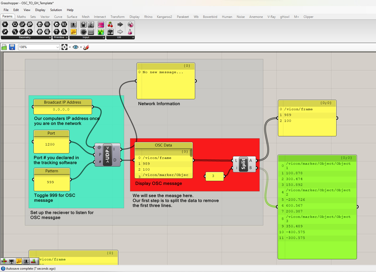 Once we receive the OSC in Grasshopper we will need to parse that data stream. The column on the left shows how the original format of the data and on the right is how we would like to parse the data into groups of X,Y, and Z coordinates. Keep in mind that the unit of measure for Vicon Tracker is millimeters.
