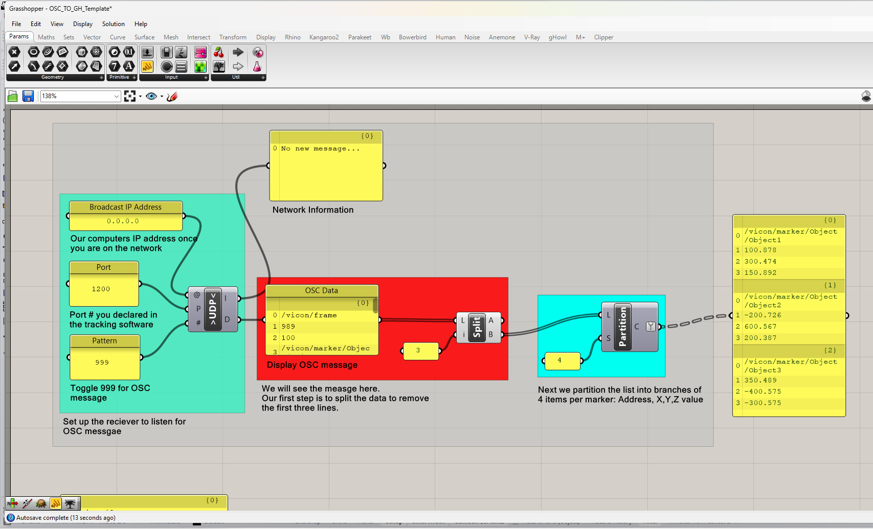 Step 3: Next we need to partition the list into groups of data per marker. To do this we will use the Partition component. This node can be found in the “Sets” tab and in the “List” module. You can see that each marker has 4 data items. The first is the address of the marker: Vicon/marker/”object name“/”marker name” and the following 3 numbers are the X,Y, and Z coordinates of that marker. We want to divide this data into groups or “branches” per marker. The partition node will do this for us. The inputs for the partition node are the list and the size of the groups you would like to divide the list into. In this case it is 4. You can see the output in the panel to the left divided into groups or branches of 4 items.