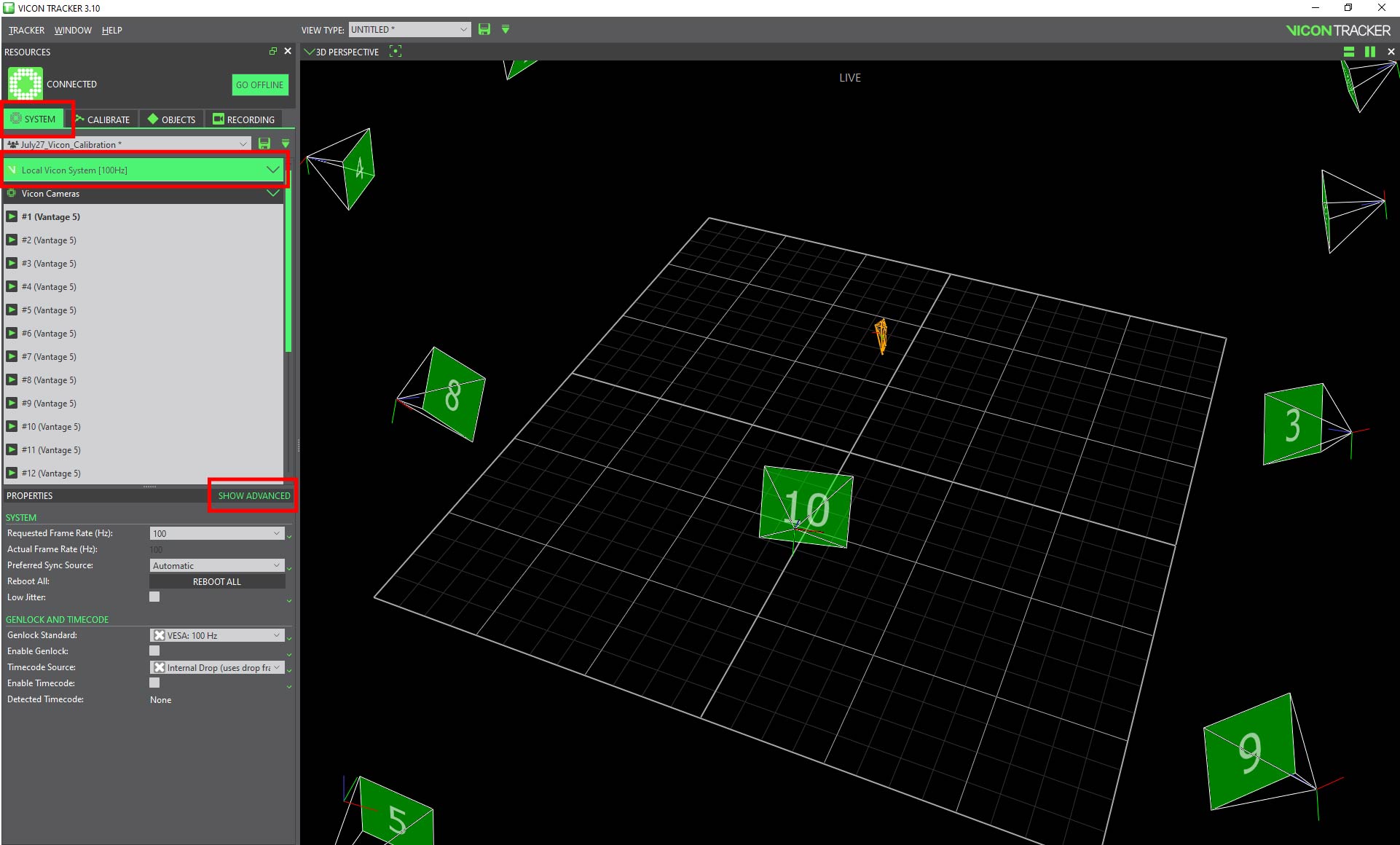 - Select the System tab at the top left of the Resources Window. Make sure you have Local Vicon System Selected. Then open the advanced settings by selecting Show Advanced at the bottom right of the window.