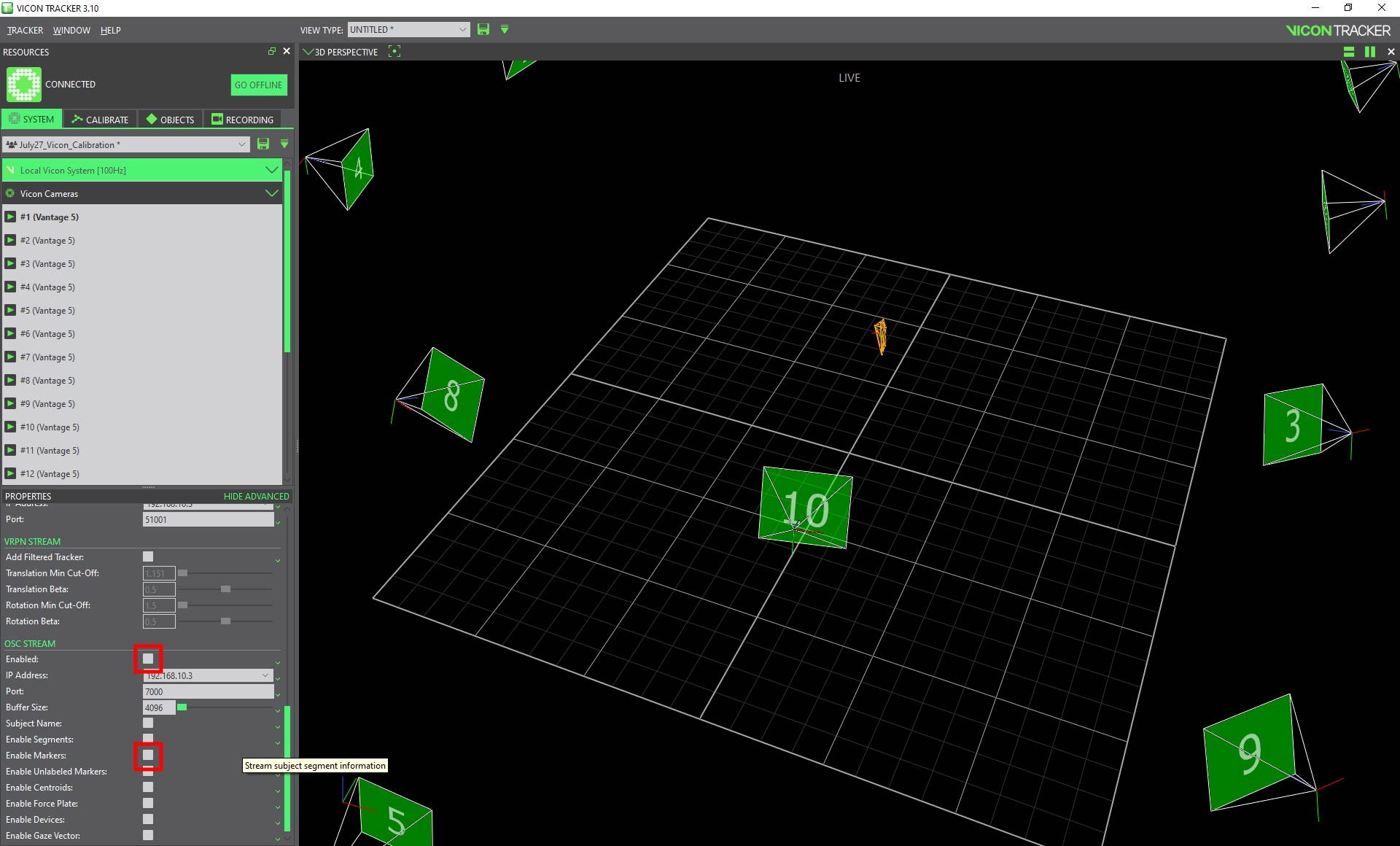 You can find the documentation for sending OSC from Vicon Tracker in the manual on pages 48 – 51. Here is a quick overview of turning on OSC streaming: