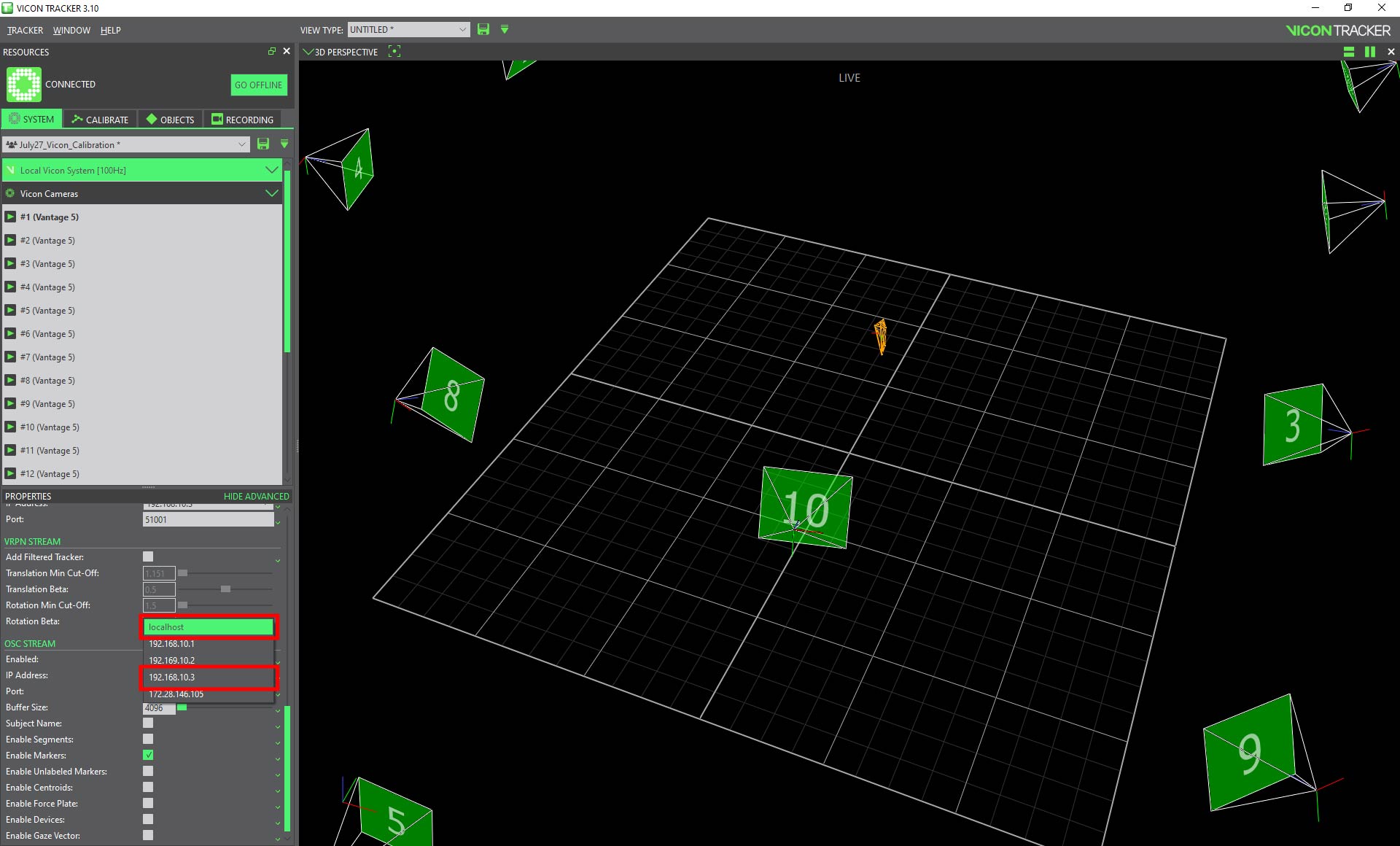 3. Select the IP Address to send the data from. This will either be localhost to use the Vicon computer or 192.168.10.3 to use the Vicon Computer and any computer connected to the LeedsLAN wifi network.